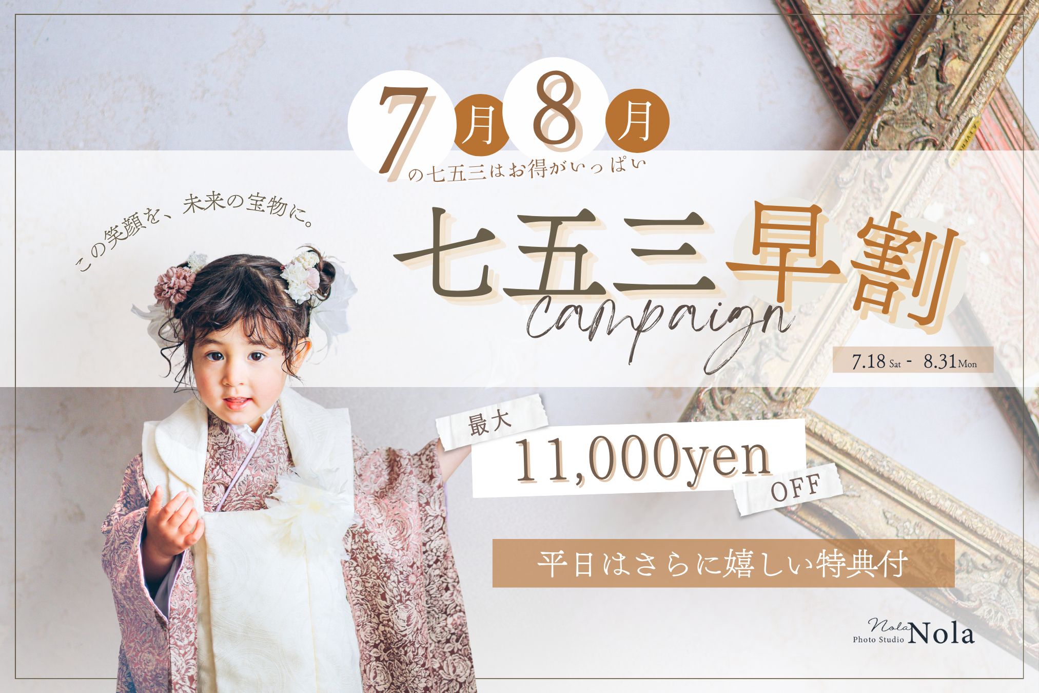 大きな窓から降り注ぐ自然光と、本物のアンティーク家具が調和する空間で、お子様の自然で美しい表情を描き出します。